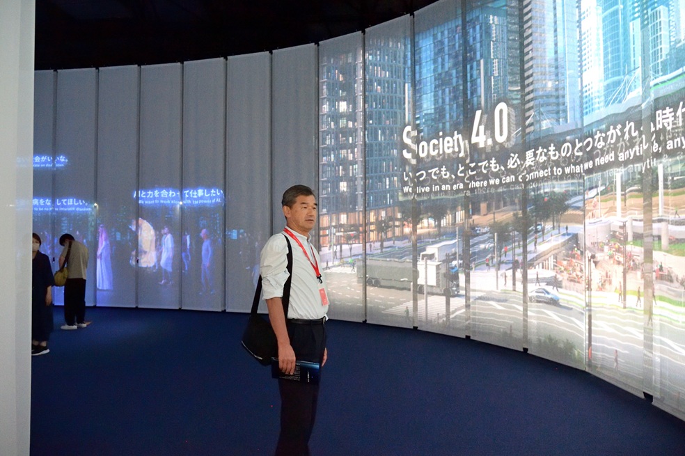 Matsui then viewed a video that contained simulations of future regional cities in the Future Cities section. The video shows harmonious cities where data from different social systems are linked using digital technologies.