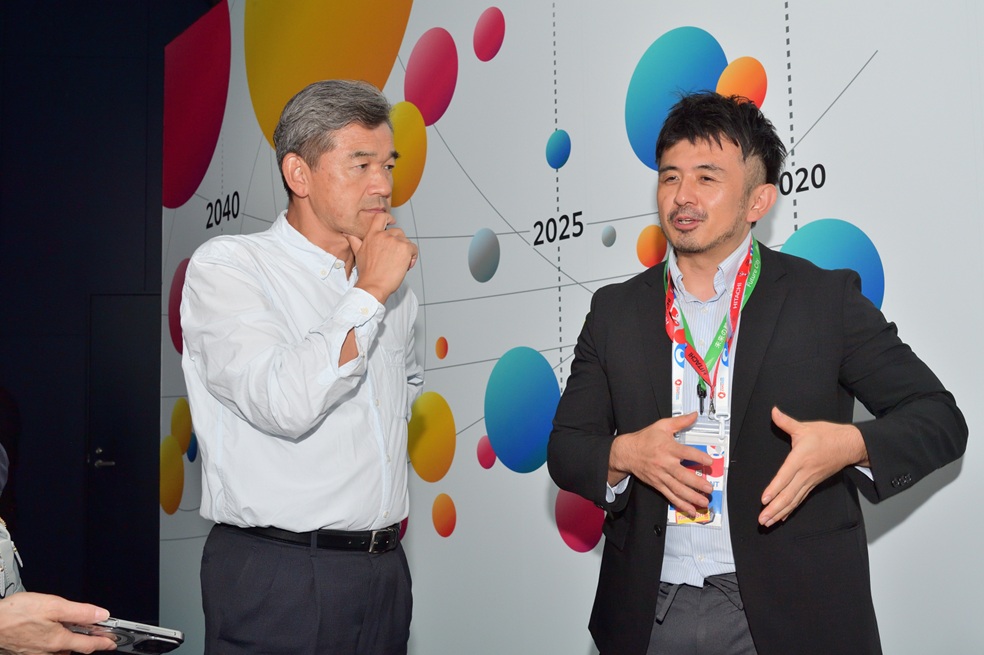 After the break following the speech, Matsui traveled to Expo 2025 Osaka, Kansai. The rain that started in the morning had stopped by the time he got to the expo. He walked around the venue for a while as the temperature was relatively comfortable. He then went to the pavilion where Hitachi was participating in the expo as an exhibitor.