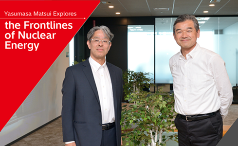 The theme of the nuclear energy sector exhibition was “Creating the Future of Nuclear Energy through One Hitachi.” The exhibition introduced Hitachi's nuclear energy sector as a whole while focusing on the BWRX-300 small light-water reactor. Of the many exhibits, the 3D model of BWRX-300 caught Matsui’s eye first. Matsui became excited looking at the 1:120 scale model of the reactor, cut to reveal its internal structure. Matsui said, “I’m a fan of models, and seeing a physical 3D object like this makes it much easier to understand than CG images. It’s also a more engaging way to present the technology.” He asked Kazuaki Kito, who was in charge of explanations at the exhibition, a series of incisive questions while looking closely at the model.
