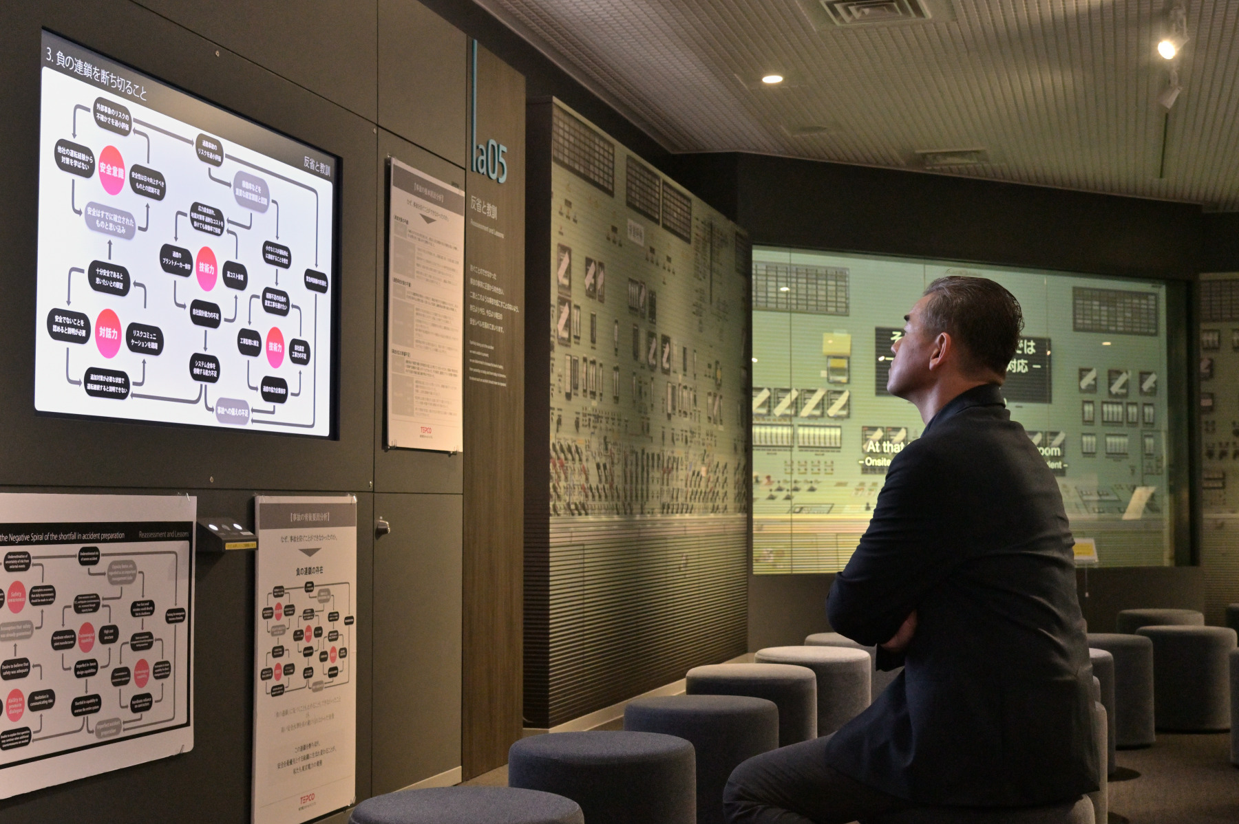 Next, the tour was guided to the displays on “reassessment and lessons” from the accident. This section examines the root cause of the Fukushima Daiichi Nuclear Power Station accident and why it could not be prevented. The root cause of the accident was inadequate measures against tsunamis, insufficient preparations to deal with severe accidents, and a lack of preparations for incident response. On the question of why the accident couldn't be prevented, the displays describe the underestimation of risks, lack of safety awareness and an increasing technical dependence on manufacturers and partner companies in the areas of design and troubleshooting, highlighting that self-directed technologies and response capabilities to prepare for an accident were lacking. This section also describes how a “vicious cycle” developed in which factors such as insufficient on-site accident response drills and supply stockpiling along with inadequate dialogue with society interacted and reinforced one another.