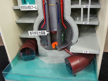 A 1/144th scale model of Unit 1 of the Fukushima Daiichi Nuclear Power Station that Matsui created himself at home in 2011 to explain the situation on news programs. The cutaway model of the pedestal section recreates the sight of how contaminated water accumulates and is designed to show how the melted-down fuel has eroded the bottom of the containment vessel.