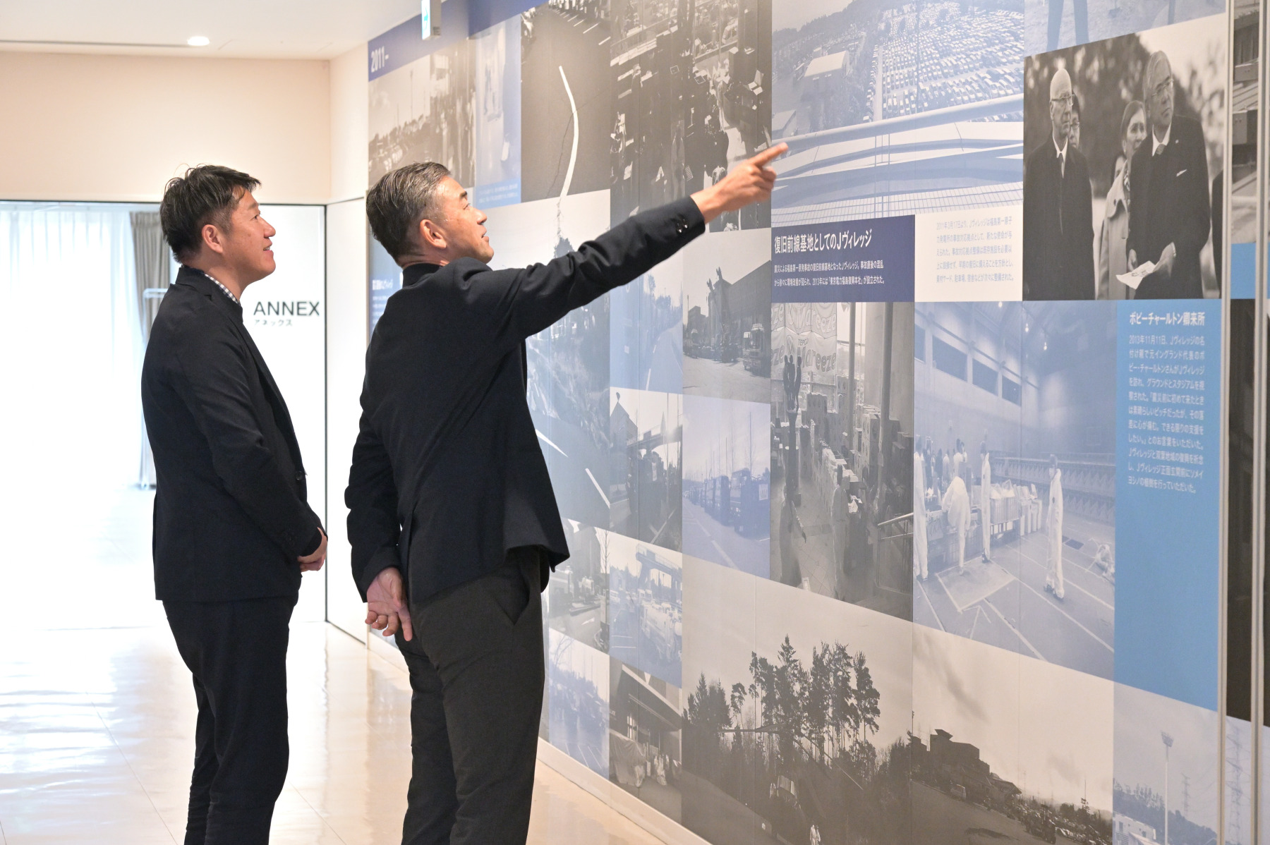 It was also Matsui's first time visiting this facility in around ten years. “When I entered the Fukushima Daiichi Nuclear Power Station after the accident as part of my reporting duties, I changed into protective clothing and put on a full-face mask here, and then bounced around on a bus heading to the power station for more than 30 minutes. This brings back memories of that time,” says Matsui. Guided by Shigenari Akashi, manager of the Planning and General Affairs Group at J-Village, Matsui reflects on the disaster while walking down J-VILLAGE STREET, which features wall displays some 60 meters in length depicting the history of J-Village.
