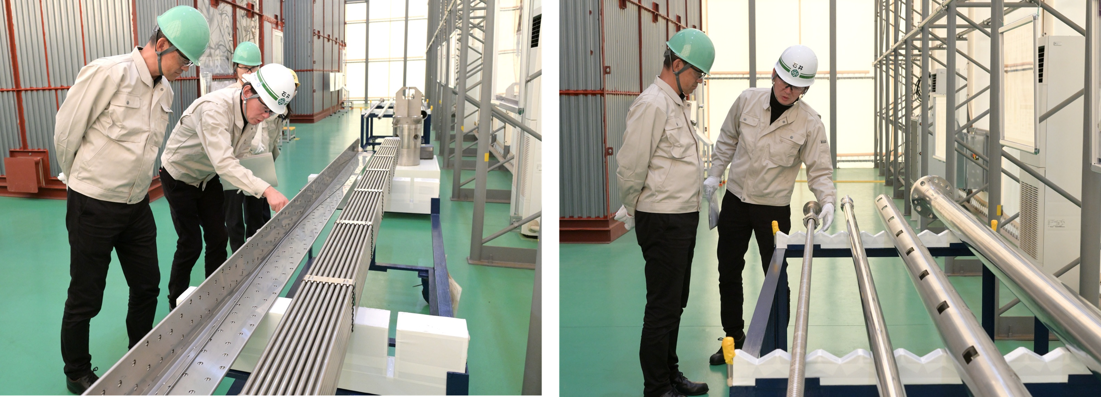 The shroud head is manufactured by processing a massive circular metal plate into a dome shape, drilling circular holes using a lathe, then welding the metal cylinders of the steam separator into these holes. There is a total of 349 cylinders, each welded individually by hand. The work is very difficult, with some sections requiring welding to be performed while viewing the workpiece in a mirror, since direct viewing is not possible. Exceptional workmanship is also required to meet the high precision, durability, and reliability demanded of internal reactor parts. Only a handful of highly experienced engineers within Hitachi are capable of performing such welding. The welding of this shroud head was handled by about ten skilled engineers.